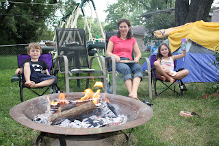 The kids have been begging to go camping and we thought this would be a good year to give it a try since the kids were old enough to really enjoy it. But being the practical person that I am, I thought that maybe we should have a trial run in the back yard before we attempted the real deal in a new place. So we unpacked the tent and got all the fixings for a fun camping meal. The weather looked great and we thought we would give it a try. The kids enjoyed setting up their beds in the tent and bringing all their books and flashlights out. We made hobo meals (potatoes, kielbasa, onions, carrots, peppers, all mixed together in a foil pouch then placed in a aluminum pan and set into the fire) and campfire cobbler. All of it was super yummy! Then of course we also toasted marshmellows and told stories before tucking the kids into bed and hoping that they would go to sleep. Apparently Labor day weekend is not the night to camp out in your back yard because there are lots of people staying up really late making lots of noise which makes it hard to go to sleep if you are an adult. I tried my best but sleeping on the ground, no matter how padded is not for me. I slipped out at around 3:30am to retreat to the couch for more comfort. Less than 45 minutes later the whole troop was coming up the stairs due to the thunder that they heard. Everyone was awake and hungry. We all ate a bowl of cereal and then crashed into our bed where we all finally got some good sleep! That is my kind of camping.....the kind where I end up in my own bed! 9.5.10